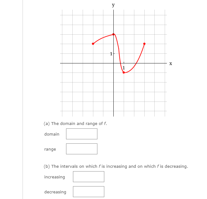 у 1 N х (a) The domain and range of f. domain range (b) The intervals on which fis increasing and on which fis decreasing. increasing decreasing
