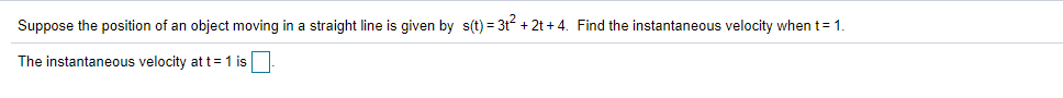 Suppose the position of an object moving in a straight line is given by s(t) = 3x2 + 2t +4. Find the instantaneous velocity when t= 1. The instantaneous velocity at t= 1 is