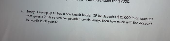 for $2300. 6. Jonny is saving up to buy a new beach house. If he deposits $15,000 in an account that gives a 7.8% return compounded continuously, then how much will the account be worth is 20 years?