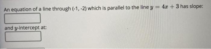 An equation of a line through (-1,-2) which is parallel to the line y = 4x + 3 has slope: and y-intercept at: