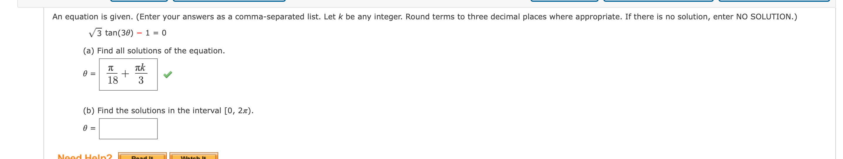An equation is given. (Enter your answers as a comma-separated list. Let k be any integer. Round terms to three decimal places where appropriate. If there is no solution, enter NO SOLUTION.) 3 tan(30) – 1 = 0 (a) Find all solutions of the equation. 0 = TT + 18 Tik 3 (b) Find the solutions in the interval [0, 21). 0 = Need Helm Road It Altch It