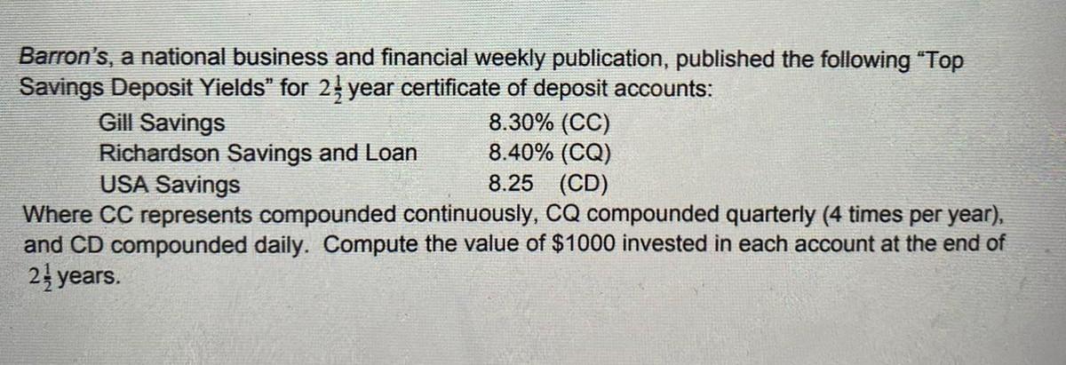 Barron's, a national business and financial weekly publication, published the following "Top Savings Deposit Yields” for 24 year certificate of deposit accounts: Gill Savings 8.30% (CC) Richardson Savings and Loan 8.40% (CQ) USA Savings 8.25 (CD) Where CC represents compounded continuously, CQ compounded quarterly (4 times per year), and CD compounded daily. Compute the value of $1000 invested in each account at the end of 24 years.