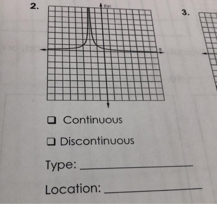 directions: defermine if the function shown on the graph is continuous. if not, identify the type (infinite, jump, or removable) and location of discontinuity